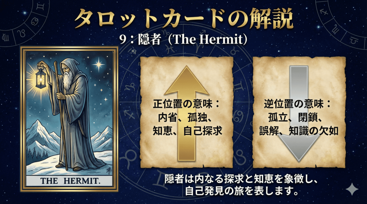 隠者は、外の世界の喧騒から離れ、自分の内面深くにある答えを探し求める時期を示します。